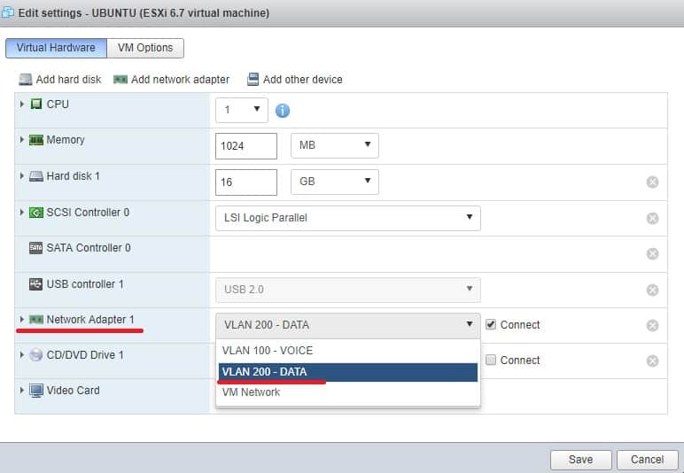 Suchen Sie in den Hardware-Einstellungen den Punkt Network Adapter 1 (oder den entsprechenden Adapter). Öffnen Sie das Dropdown-Menü und wählen Sie die soeben erstellte Portgruppe (z. B. «VLAN 200 – DATA») aus.