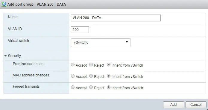 Klicken Sie auf Add, um die Gruppe zu speichern. Wiederholen Sie diesen Vorgang für weitere Netze, wie zum Beispiel für ein Daten-Netz (VLAN 200).