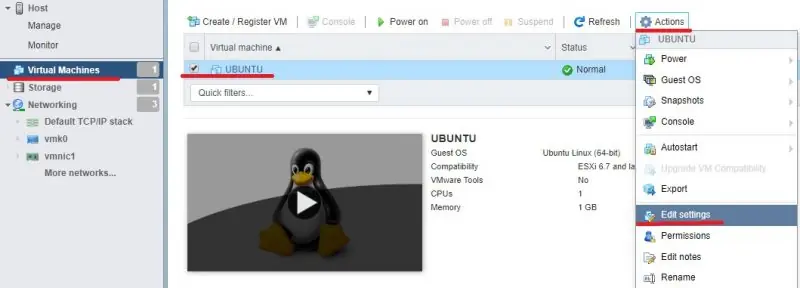 - Rechtsklick auf die gewünschte VM (oder über das Menü «Actions») → Edit settings.